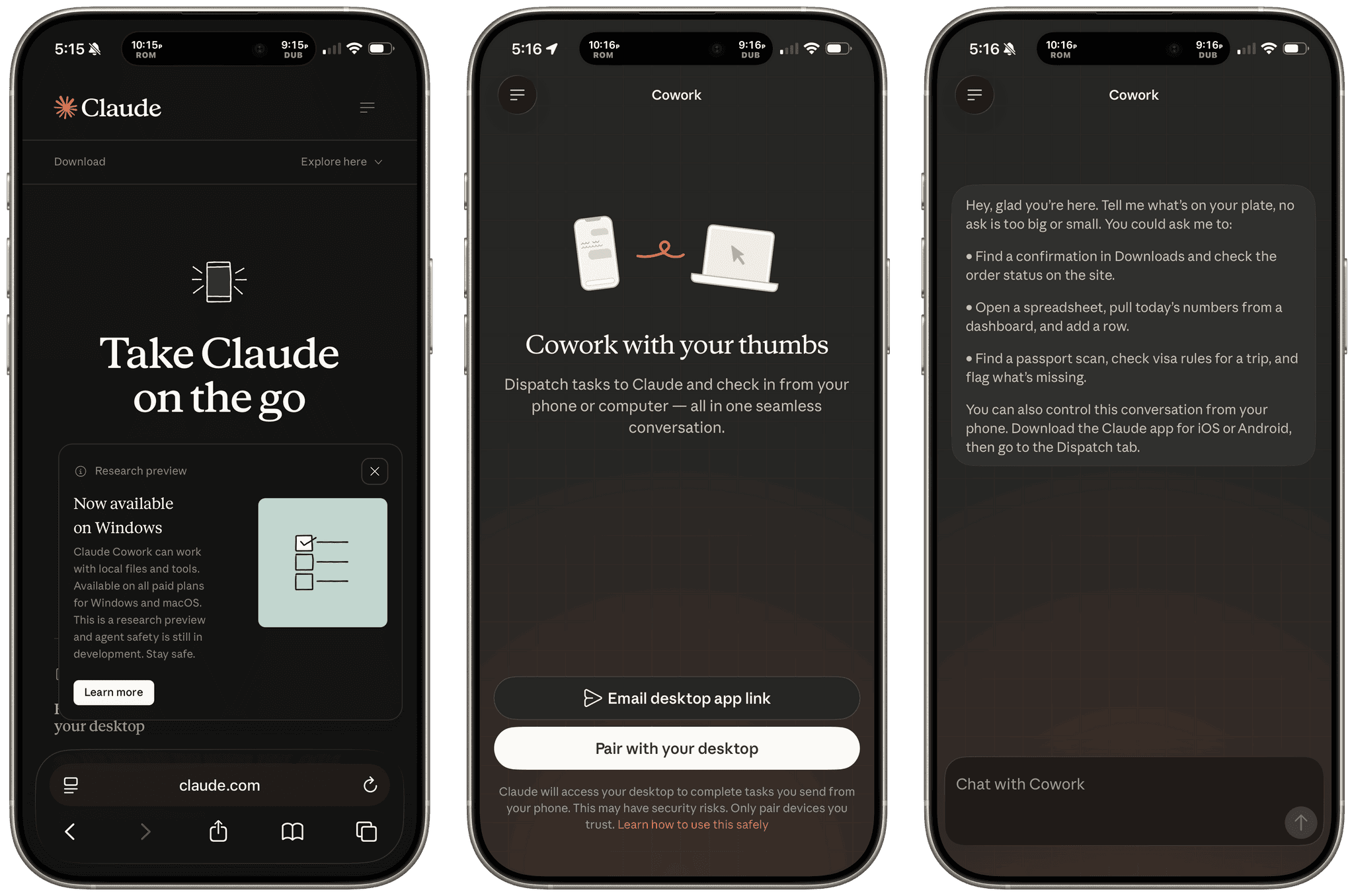 Anthropic 在 2026 年 3 月 17 日推出 Claude Cowork 的新功能 Dispatch(研究預覽版),讓使用者用手機對桌面端的 Claude 下達任務,回來就能看到完成的成果。 Max 方案用戶當天就能使用,Pro 方案用戶隔天跟進。這代表 Anthropic 正在把「AI agent 隨時待命」從開發者專屬的 Claude Code 擴展到一般知識工作者。