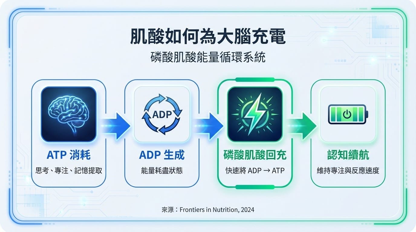 大腦雖僅佔體重約 2%,卻消耗全身約 20% 的能量。每一次專注思考或記憶提取,都需要三磷酸腺苷(ATP)作為燃料。當 ATP 消耗後,磷酸肌酸(Phosphocreatine)能將二磷酸腺苷(ADP)快速回充為 ATP。這套能量循環系統在肌肉中已被充分研究,近年研究則證實腦部同樣仰賴此機制維持高效運作。