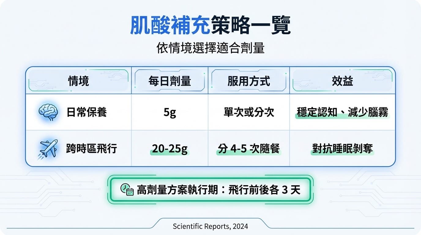 長途飛行後的時差(Jet Lag)本質上是睡眠剝奪導致的認知功能衰退。2024 年發表於《Scientific Reports》的研究提供了一套經過驗證的高劑量方案:以體重為基準,單次補充 0.35 g/kg 的肌酸。以 70 公斤成人為例,約為 24.5 克,實務操作可取整數 25 克。
