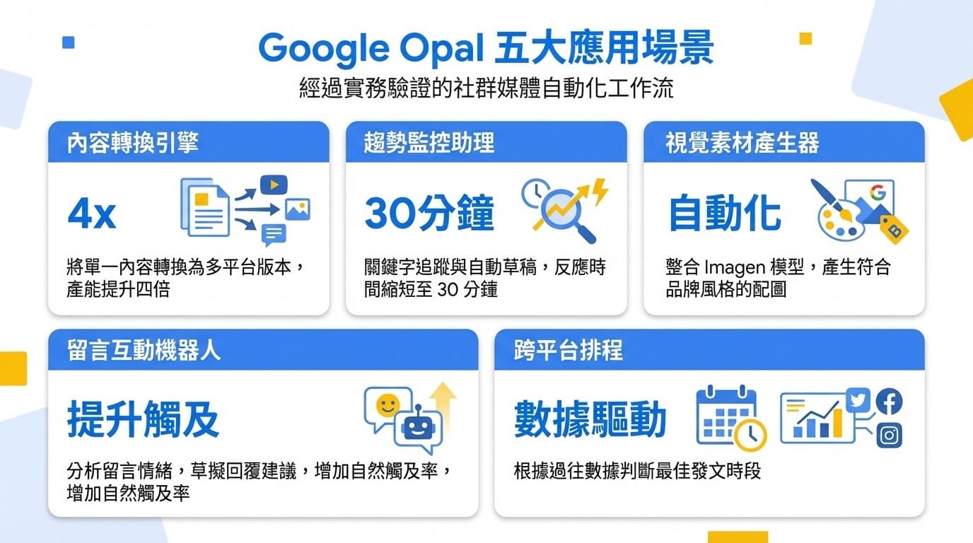 對社群媒體經營者而言,Opal 最實用的功能在於內容自動化工作流。根據 KDNuggets 在 2025 年 12 月的報導,已有創作者利用這項工具將單一長篇內容同步轉換為 LinkedIn 貼文、Twitter 串文和 Instagram 圖片,整個流程耗時不到 20 分鐘。