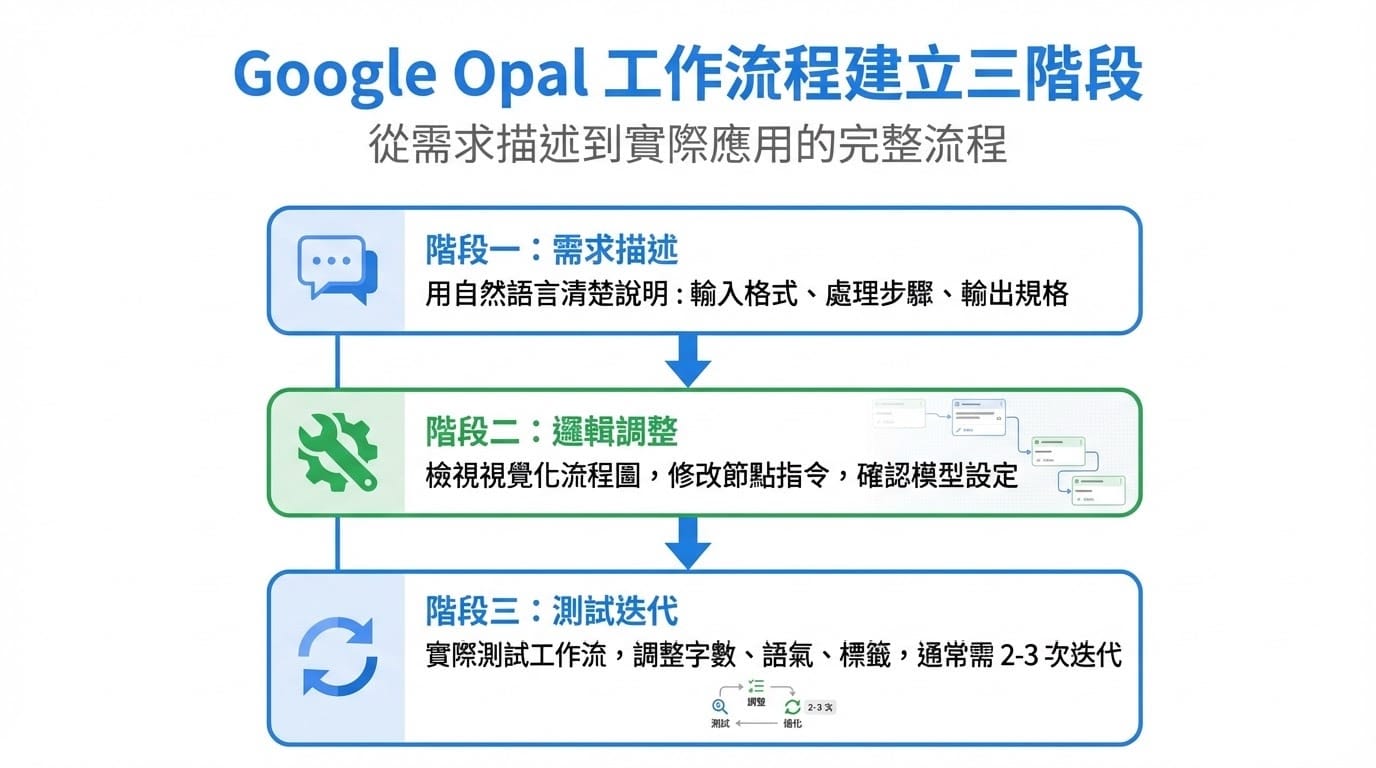 目前 Opal 對英文的理解與產出品質最佳,中文支援相對有限。台灣使用者的實務做法是先用英文建立工作流,在最後階段加入「翻譯為繁體中文」的節點。這個過渡方案在 Google 改善中文模型效能前仍會持續。