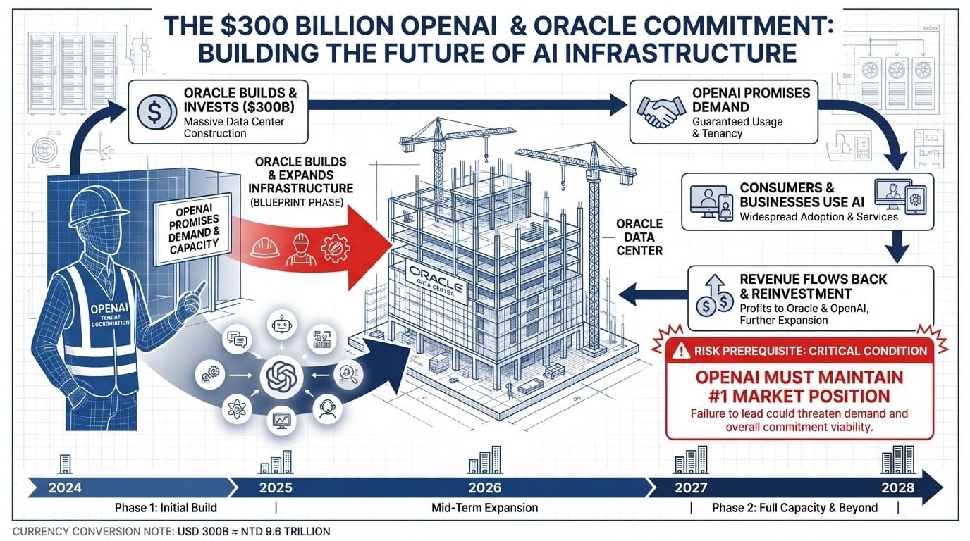 Oracle 必須先承擔巨額的建設成本和風險,因為 OpenAI 承諾了 3000 億美元的需求。但這個承諾的兌現取決於兩個關鍵前提: