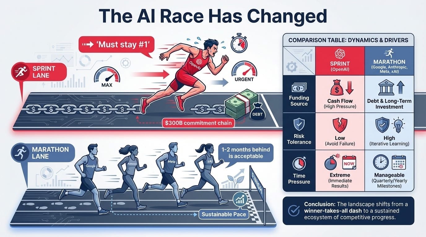 AI 競賽正在從追求通用人工智慧(AGI)的技術競賽,轉變為一場生存競賽——看誰能夠撐過 OpenAI。因為只要能夠保持與 OpenAI 一到兩個月的差距,就足以讓 OpenAI 面臨巨大壓力。