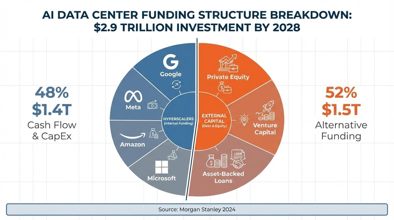 根據 Morgan Stanley 的預測,到 2028 年,這些超大規模運算企業在資料中心的總投資預計將達到 2.9 兆美元。其中約 1.4 兆美元來自企業自有現金流和資本支出,但仍有高達 1.5 兆美元的資金缺口需要透過其他管道填補。