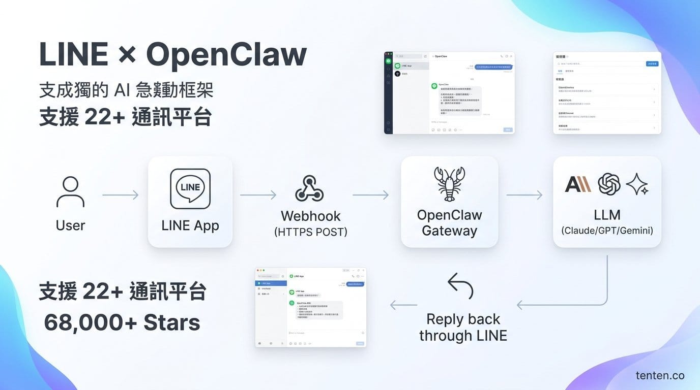 OpenClaw 可以直接串接 LINE 官方帳號,透過 LINE Messaging API 讓你的 AI 代理人在 LINE 上回覆客戶訊息、處理預約、甚至跨平台轉發工作指令。截至 2026 年 3 月,OpenClaw 的 GitHub 星數超過 68,000 顆,官方文件明確將 LINE 列為支援的 22 個通訊頻道之一,透過獨立安裝的 plugin 模組(@openclaw/line)運作。對台灣企業來說,LINE 的月活躍用戶超過 2,100 萬、滲透率超過九成,把 AI Agent 接上 LINE 等於直接進入客戶最常用的溝通管道。