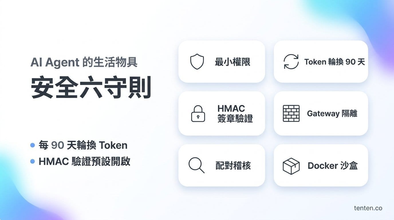 | 沙盒化執行 | 用 Docker 跑 OpenClaw,限制檔案系統和指令執行範圍 |