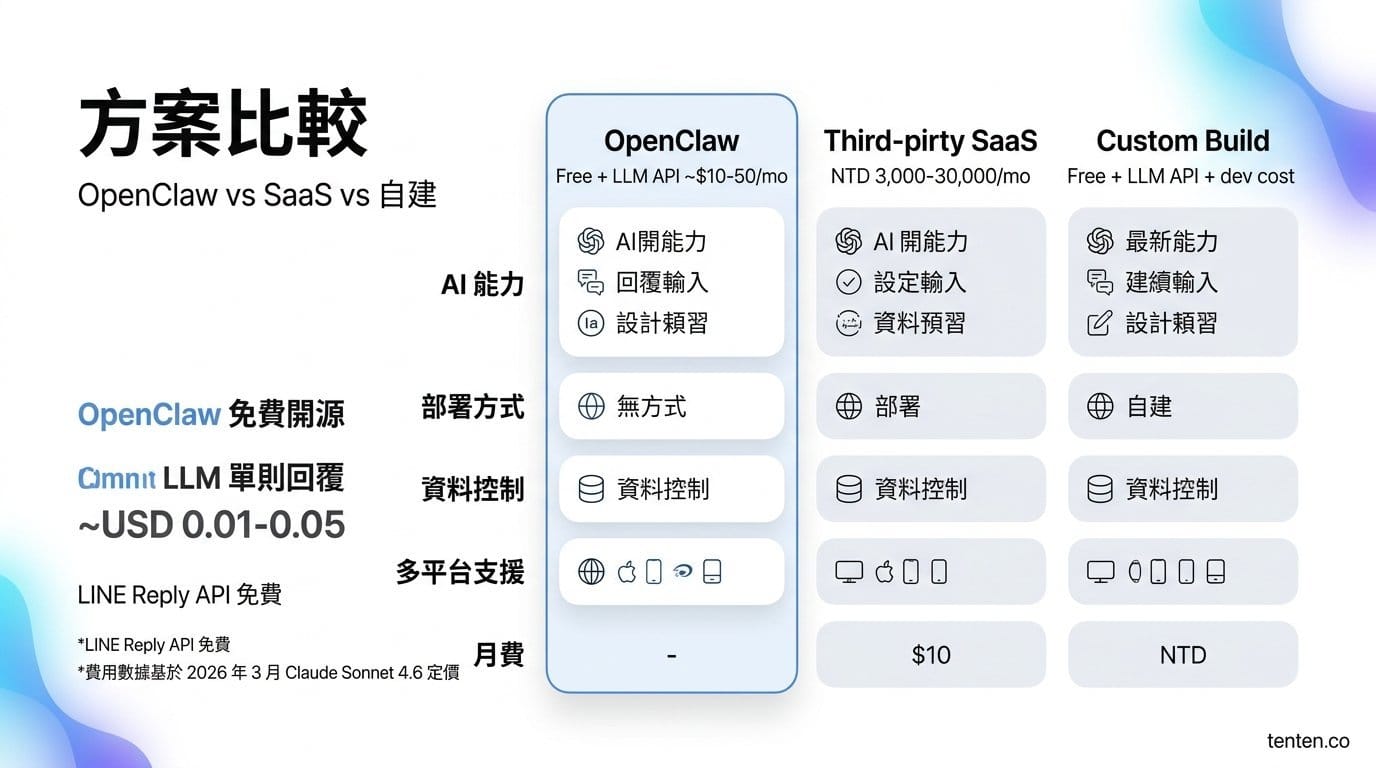 | 比較項目 | OpenClaw + LINE | LINE Bot SDK 自建 | 第三方 SaaS(如 GOSU、漸強實驗室) |