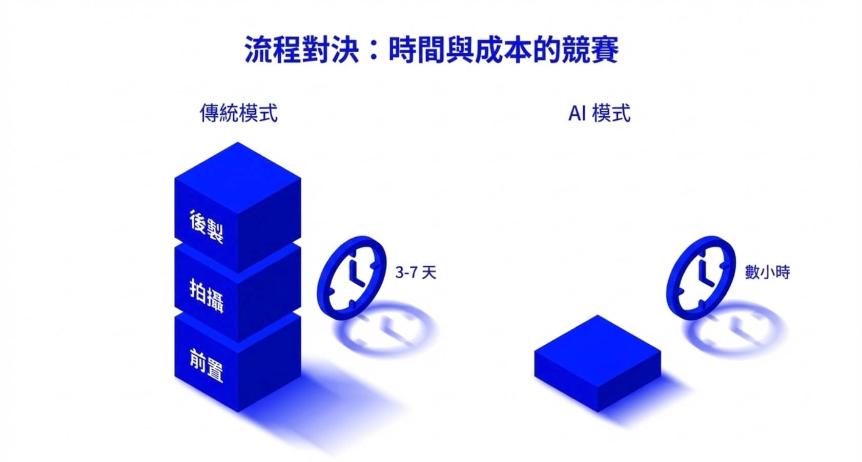 | 製作時間 | 3-7 天(含前置、拍攝、後製) | 數小時(基於既有素材) |